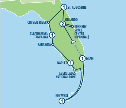 Miami • Orlando • Kennedy Space Center (optional) • St. Augustine • Crystal River • Clearwater / Tampa Bay • Sarasota • Naples • Everglades • Florida Keys • Key West