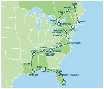 New York City • Boston • New England • Québec City • Montréal • Ottawa • Toronto • Niagara Falls • Gettysburg • Pennsylvania Dutch Country • Washington, D.C. • Williamsburg • Blue Ridge Mountains • Great Smoky Mountains • Gatlinburg • Nashville • Memphis • New Orleans • Mississippi Gulf Coast • Pensacola • Orlando • Kennedy Space Center • Miami